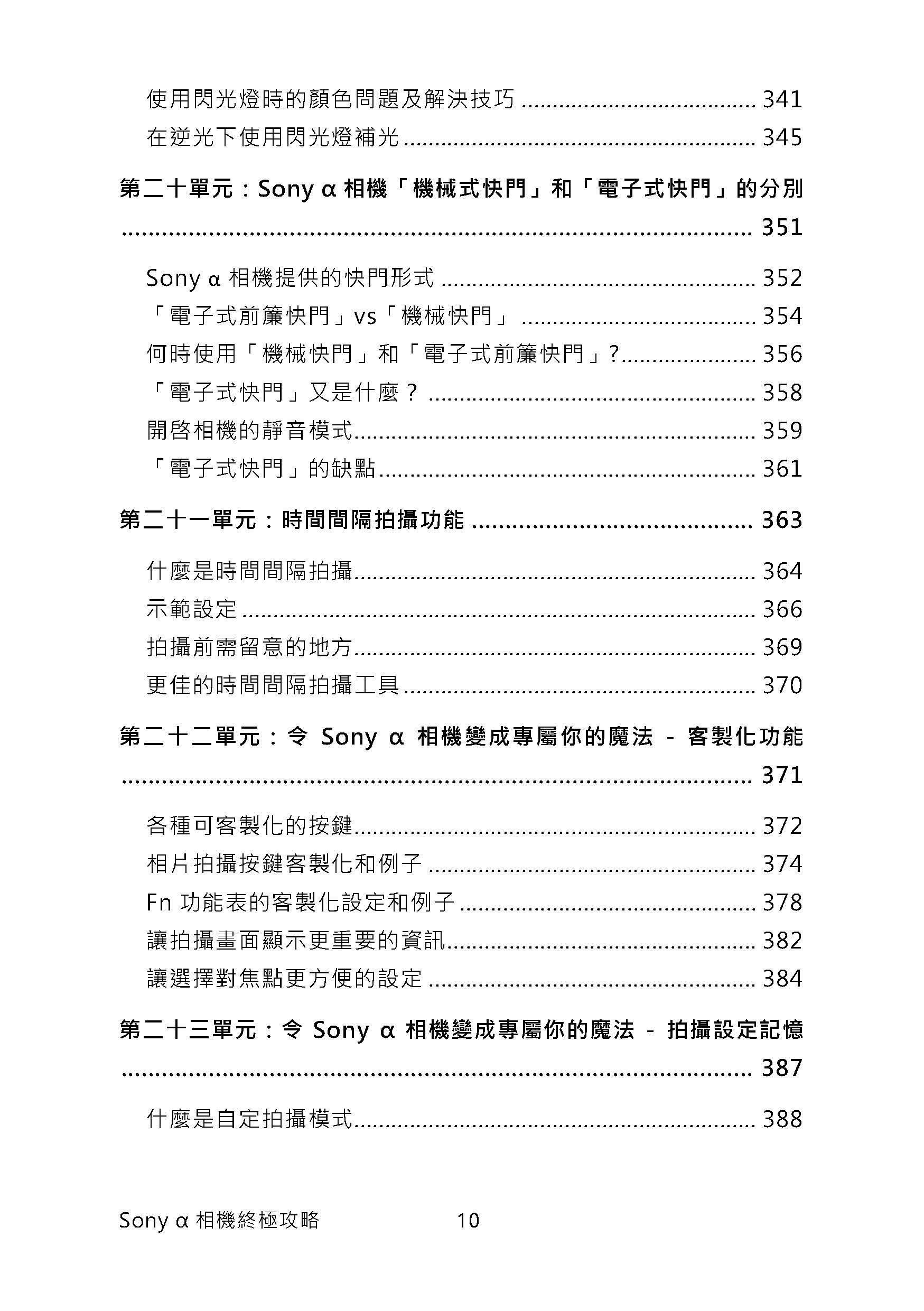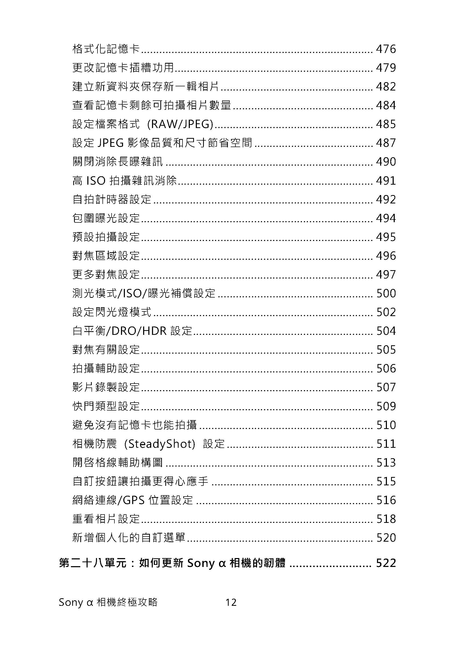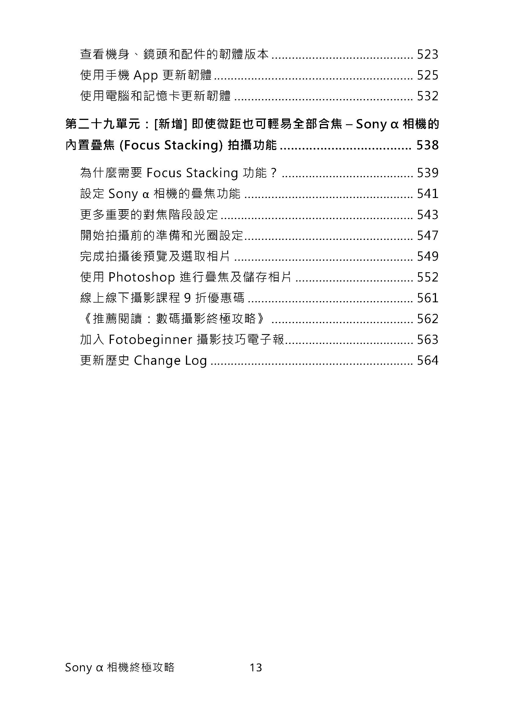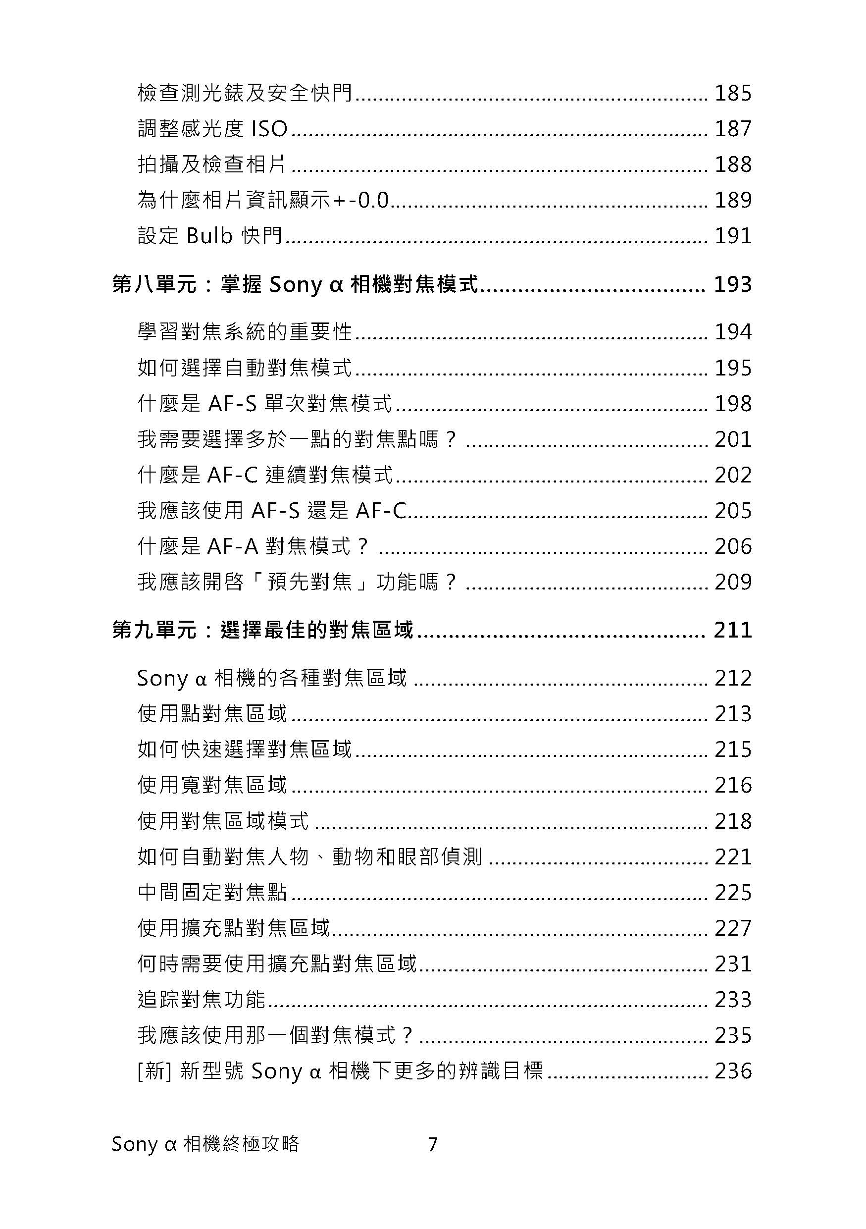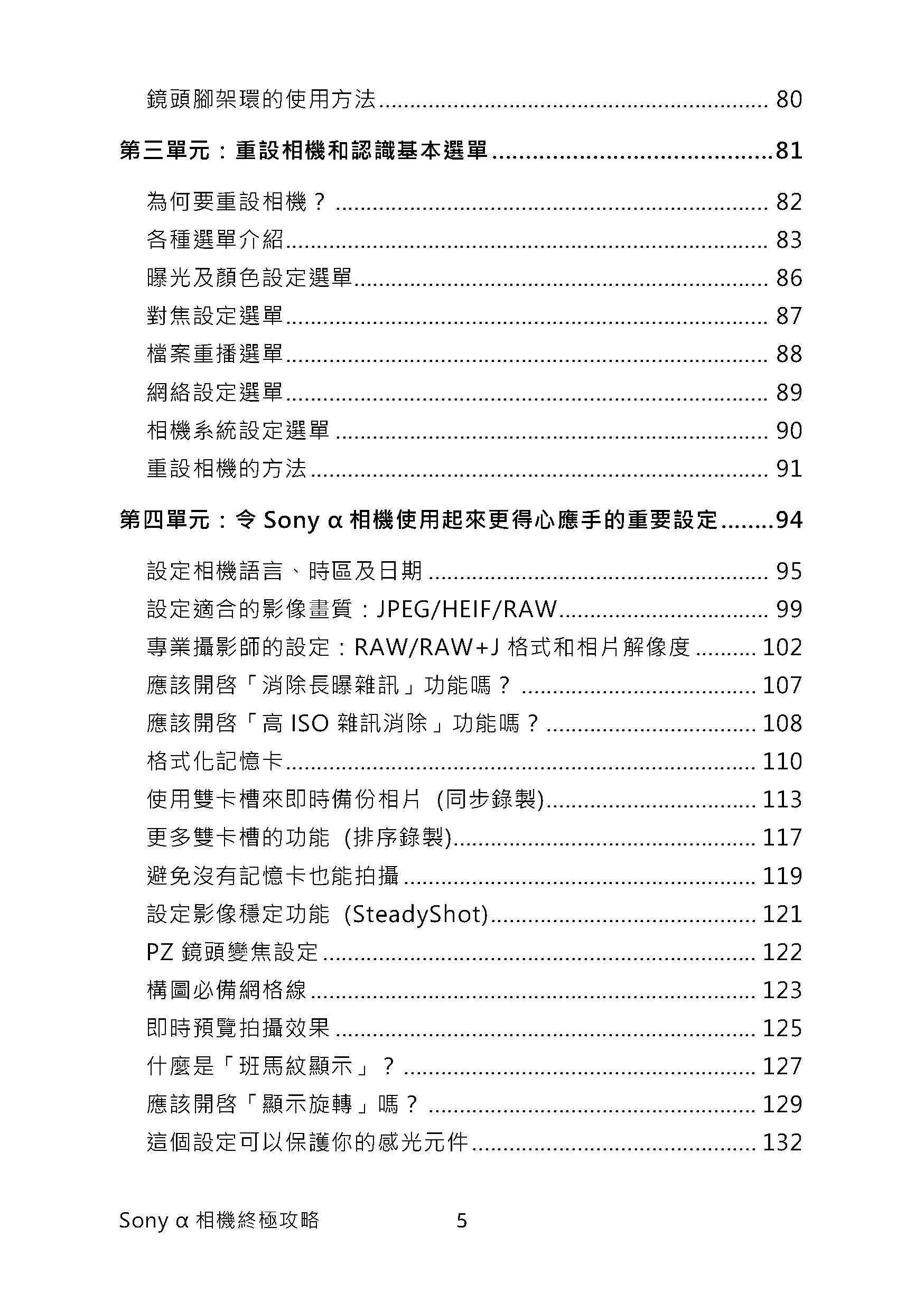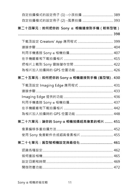 無論你是 Sony α 新手或是已有一定使用經驗,這本電子書都會成為你最值得信賴的參考攻略。書中以超過 560 頁精緻圖文詳解,涵蓋 29 個主題單元,逐步引導你掌握 Sony α 系列相機的設定、操作、拍攝模式、對焦技巧、後期設定、鏡頭選擇等各種實戰技巧,更加入最新 Sony α 系列相機專屬功能,如像素偏移、自動追焦、人物柔化、疊焦拍攝等進階應用,務求讓你盡用 Sony α 的專業功能,拍出更美的相片!