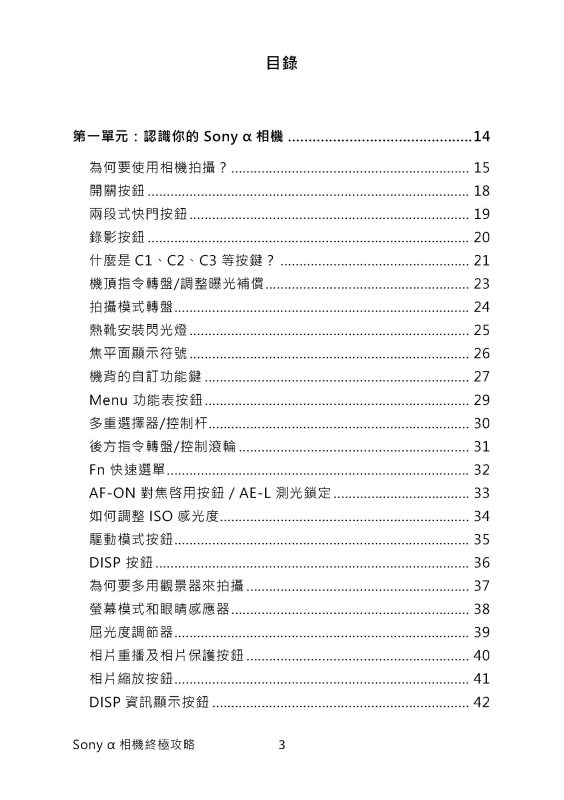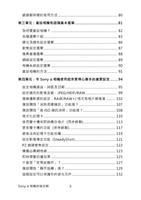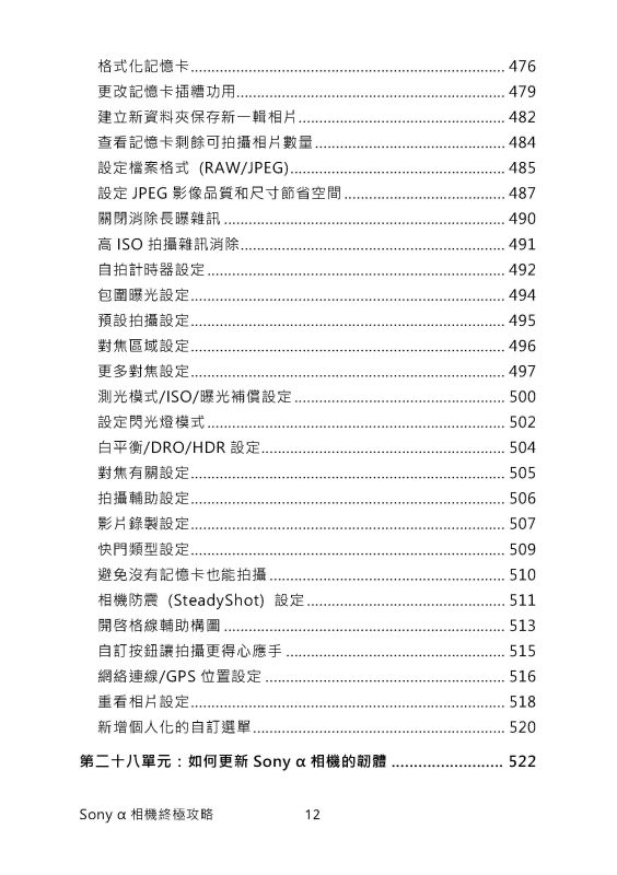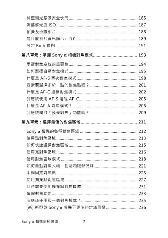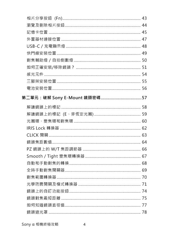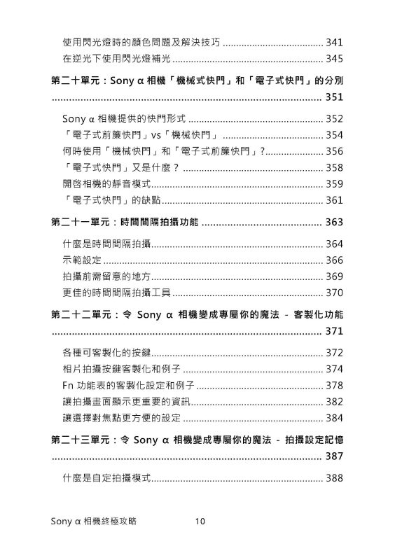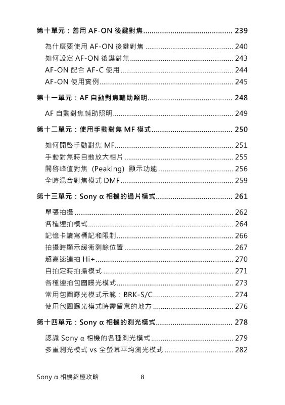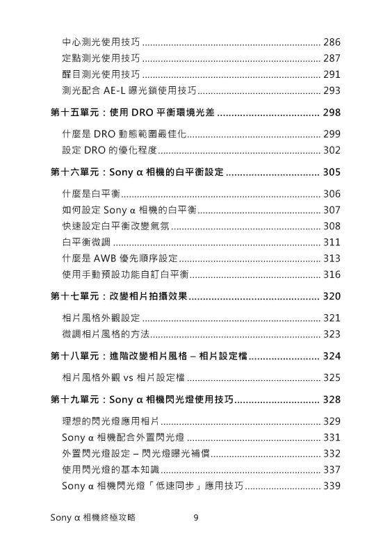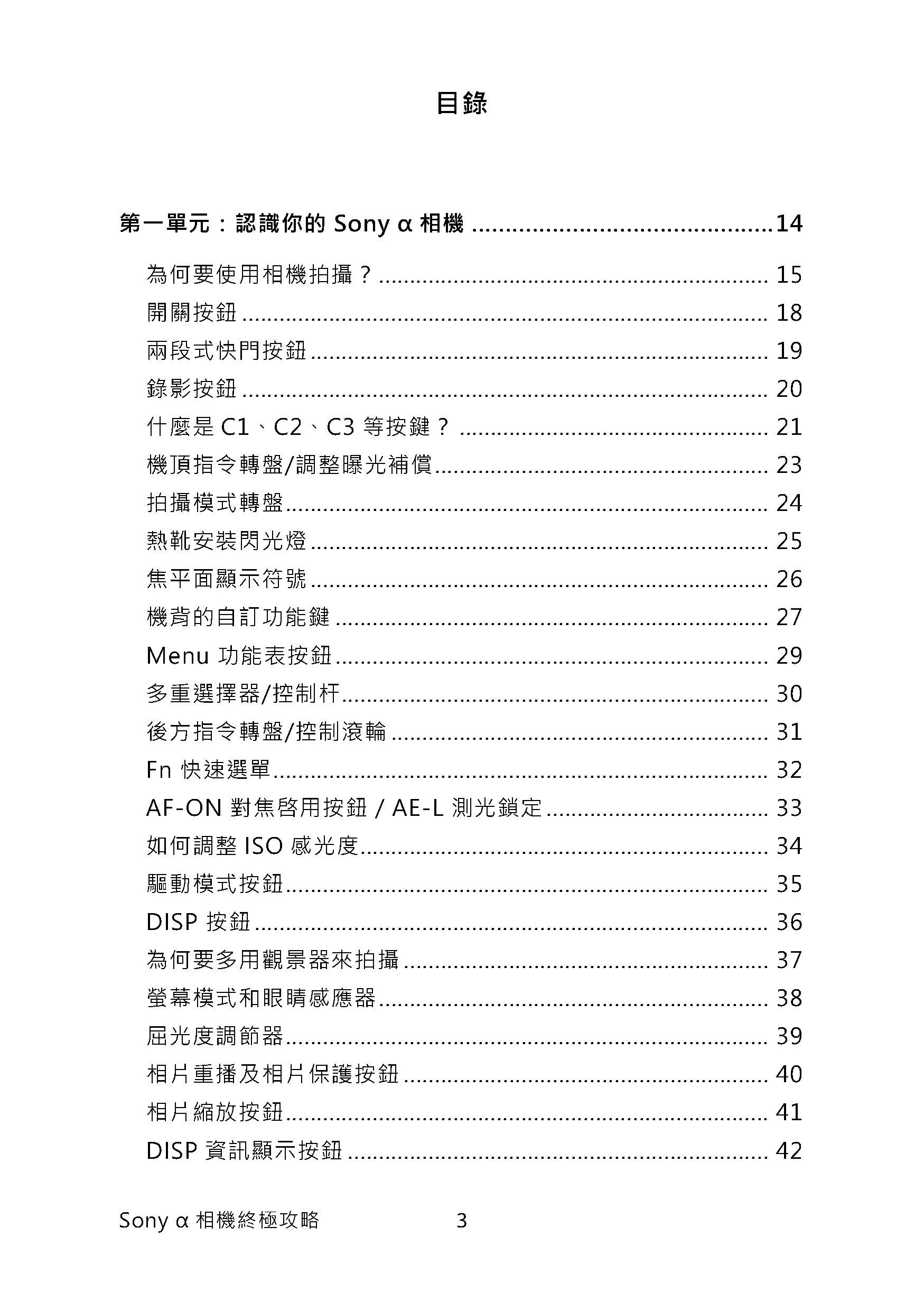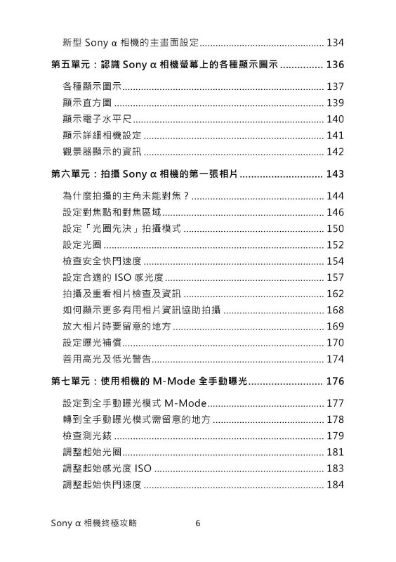 無論你是 Sony α 新手或是已有一定使用經驗,這本電子書都會成為你最值得信賴的參考攻略。書中以超過 560 頁精緻圖文詳解,涵蓋 29 個主題單元,逐步引導你掌握 Sony α 系列相機的設定、操作、拍攝模式、對焦技巧、後期設定、鏡頭選擇等各種實戰技巧,更加入最新 Sony α 系列相機專屬功能,如像素偏移、自動追焦、人物柔化、疊焦拍攝等進階應用,務求讓你盡用 Sony α 的專業功能,拍出更美的相片!