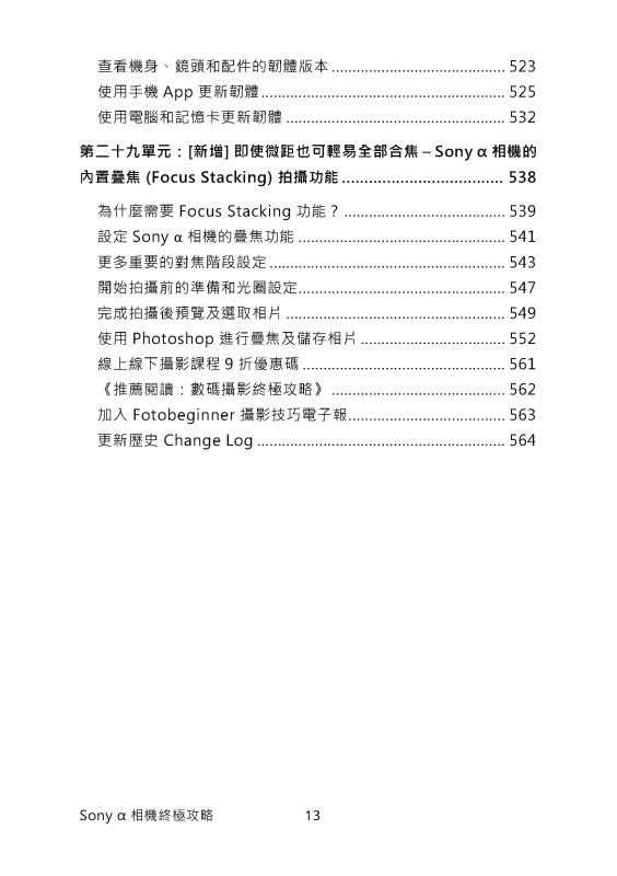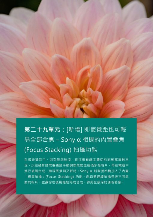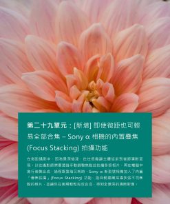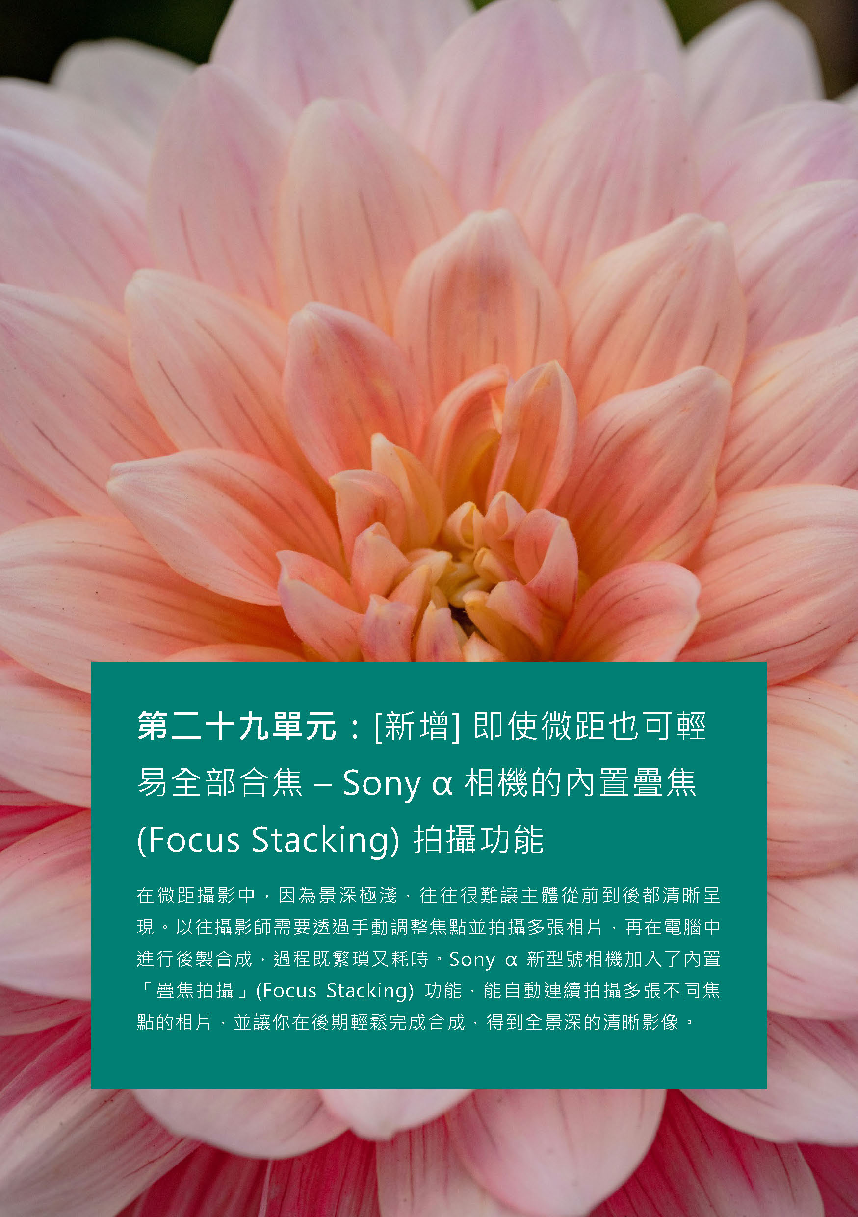 教你查看相機、鏡頭與配件的韌體版本,並透過手機或電腦更新。確保功能保持最新、兼容性與穩定性最佳。 - 第二十九單元:Sony α 相機內置疊焦(Focus Stacking)功能