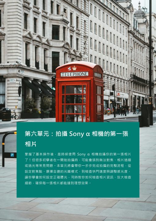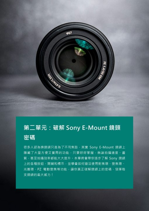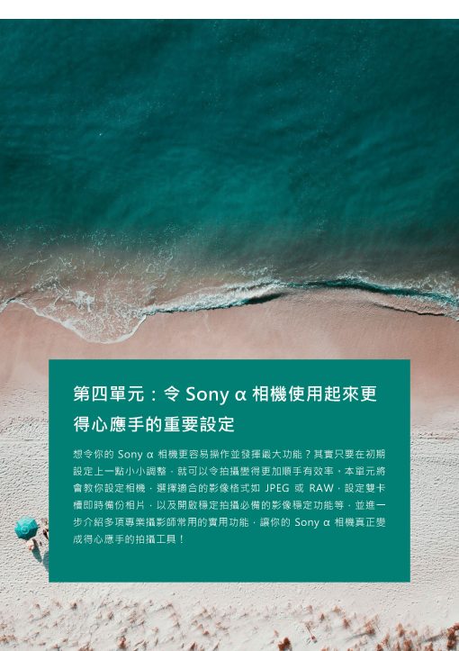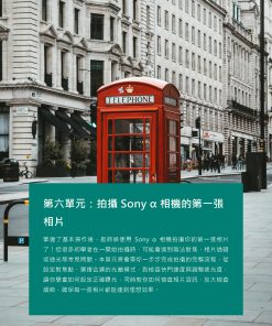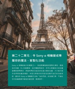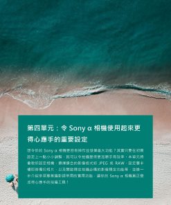 - 每個相機操作技巧也是使用 Sony α 時必須學習和了解的,以分享精要為主,讓同學可以快速、有效地提升攝影功力