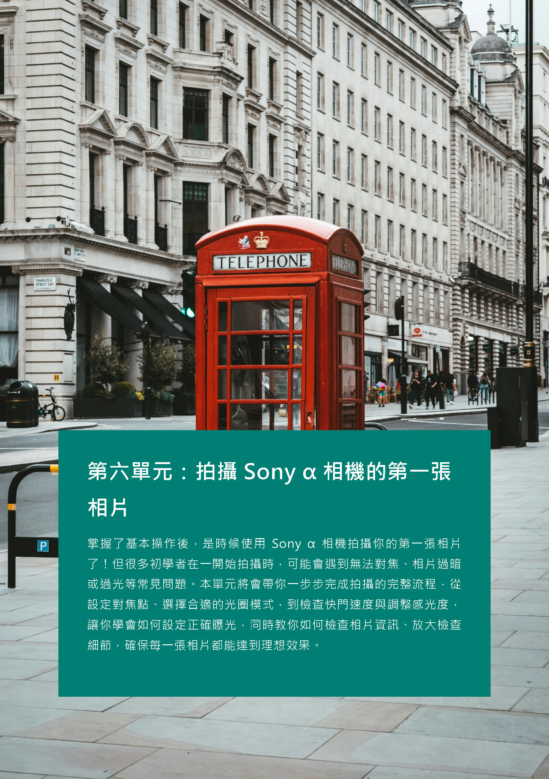 講解 Sony α 螢幕與觀景器顯示資訊的涵義,包括曝光參數、直方圖、電子水平尺、對焦區域與設定指示等。透過了解顯示內容,拍攝時能更精準地判斷曝光、構圖與相機狀態。 - 第六單元:拍攝第一張相片