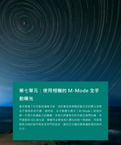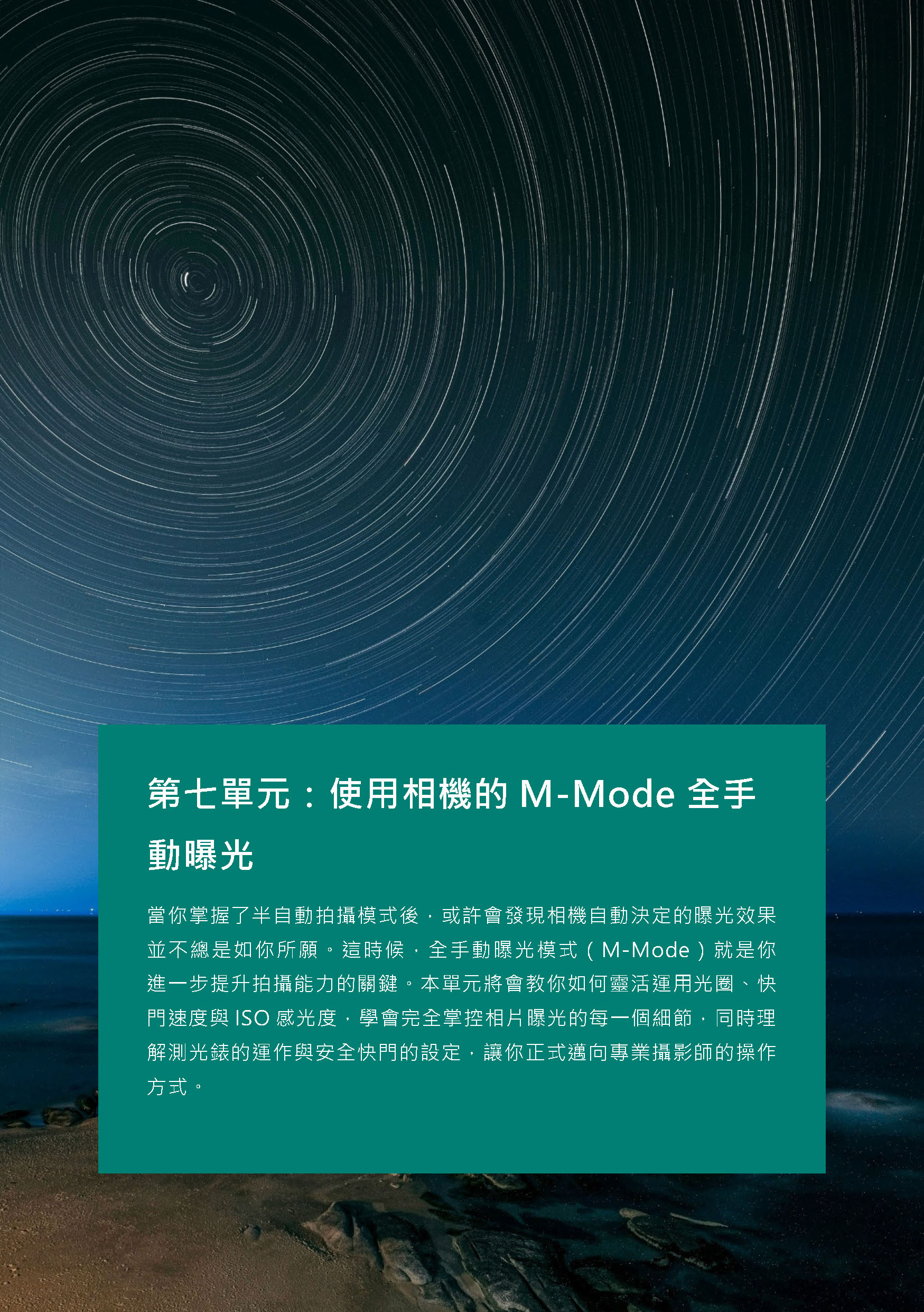 學習從設定對焦點、光圈、ISO 到曝光補償的完整步驟。掌握「光圈先決」模式下的操作與安全快門概念,並學會如何檢查與重播相片資訊,讓初學者能正確拍出第一張理想的作品。 - 第七單元:使用 M-Mode 全手動曝光