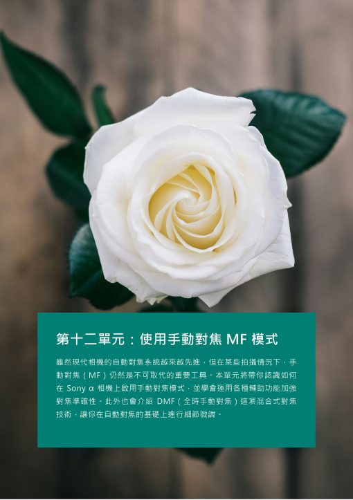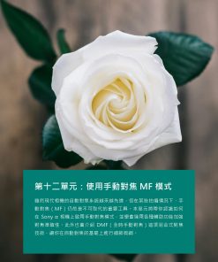 教你如何切換至手動對焦,配合放大顯示與峰值對焦(Peaking)提升精準度,同時介紹 DMF 全時混合對焦的應用,讓你在特殊場景下能兼顧速度與準確性。 - 第十三單元:Sony α 相機的過片模式