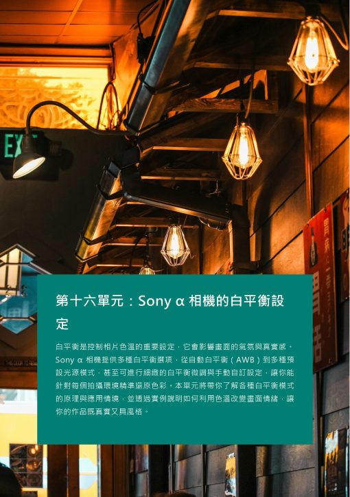 解釋 Sony 的動態範圍最佳化(DRO)功能原理與等級設定,幫助你在高反差場景下保留更多明暗細節,減少過曝與死黑問題。 - 第十六單元:白平衡設定