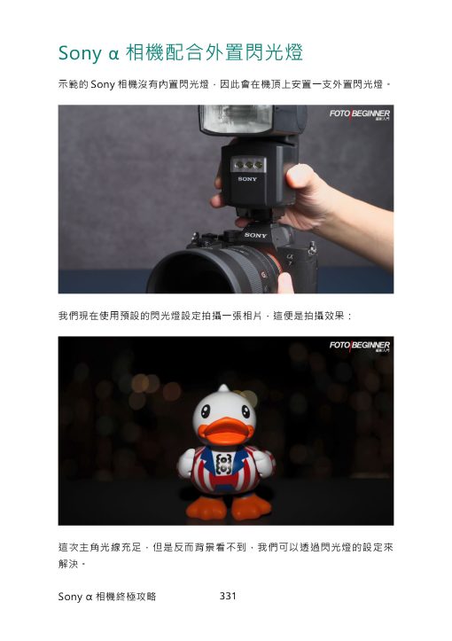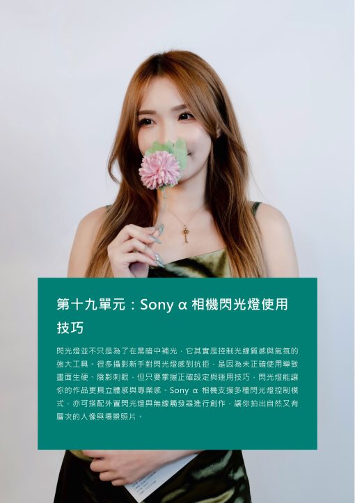 比較「相片風格外觀」與「相片設定檔」的差異,說明如何應用不同設定檔以配合後期製作或影片拍攝,掌握專業影像色彩控制技巧。 - 第十九單元:Sony α 相機閃光燈使用技巧