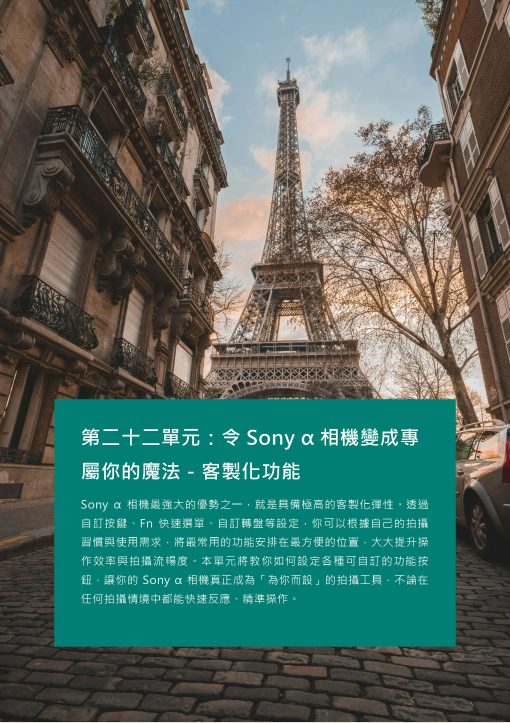 學習使用相機的 Interval 拍攝設定製作縮時影片,了解間隔時間、曝光設定與拍攝技巧,並介紹可輔助的進階工具。 - 第二十二單元:客製化功能 – 讓相機變成專屬你的魔法